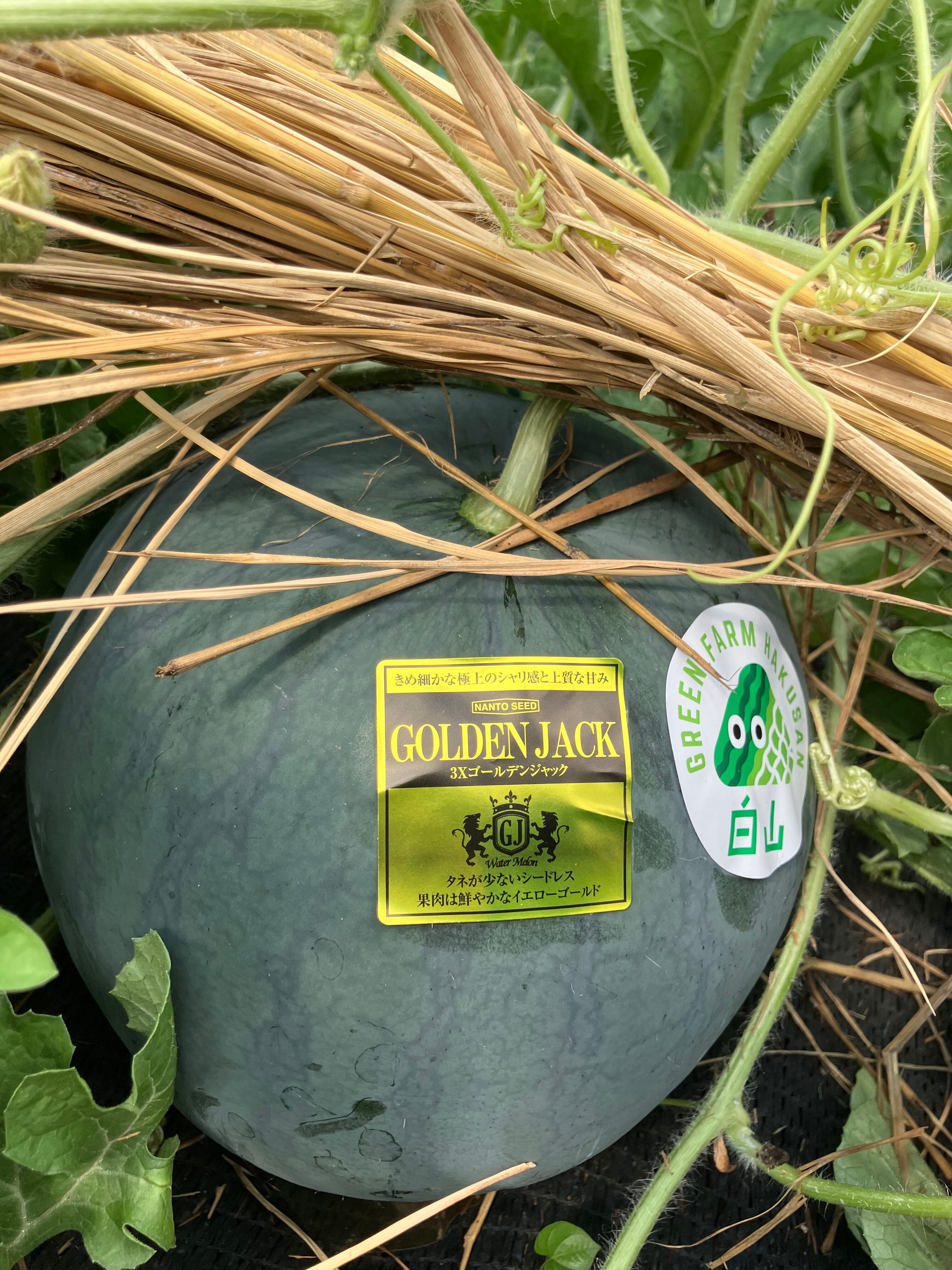 果皮は漆黒色で薄く縞が入り、果肉は濃いレモンイエローのシードレス。糖度14度以上。 果肉質は繊維質が少なく食感に優れ、硬めでしっかりとした肉質。 2025年から販売開始。この機会に是非ご賞味ください。